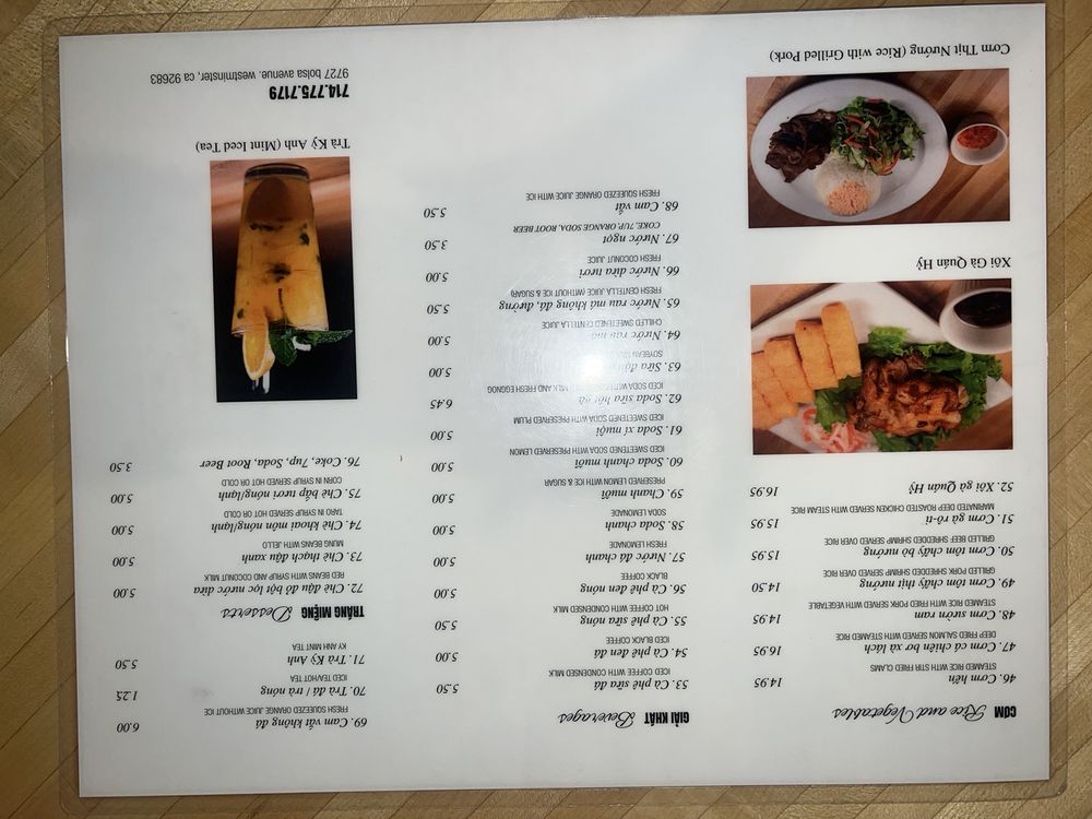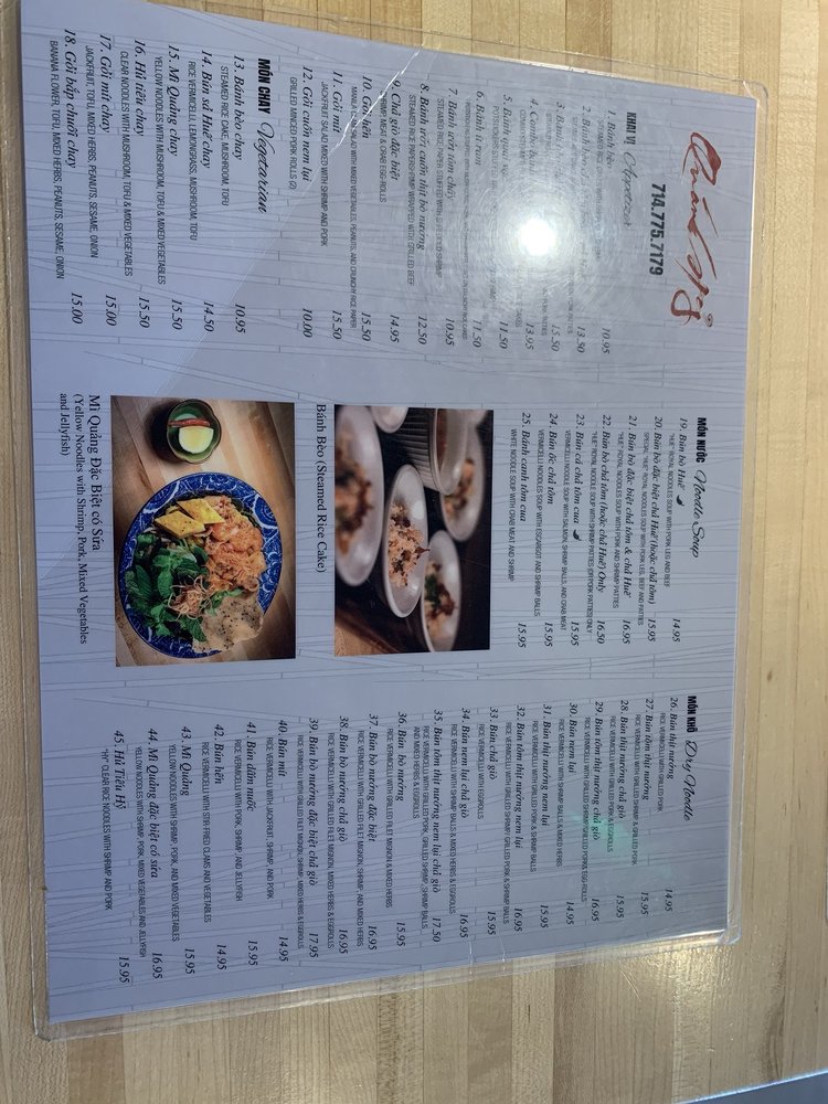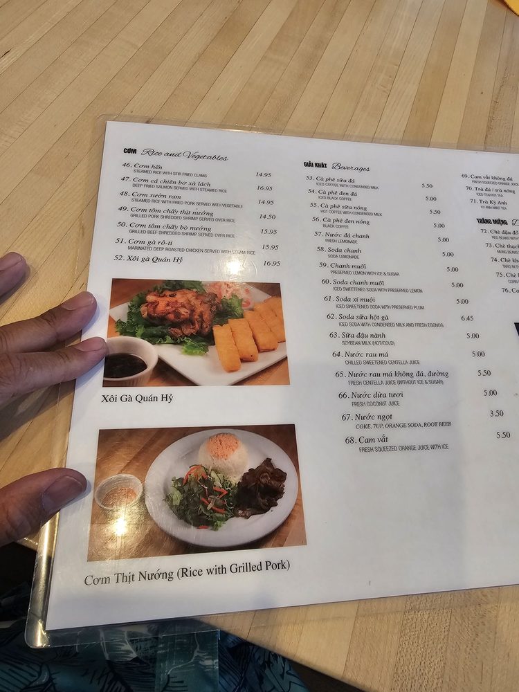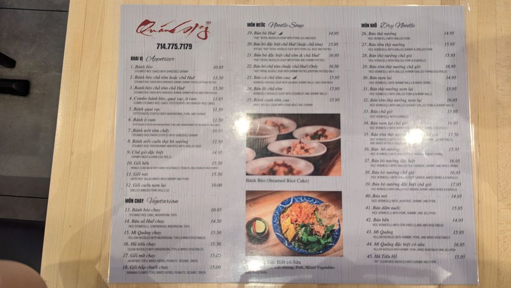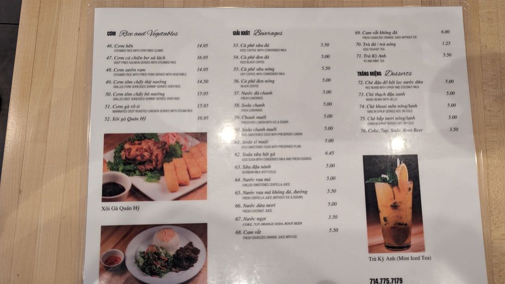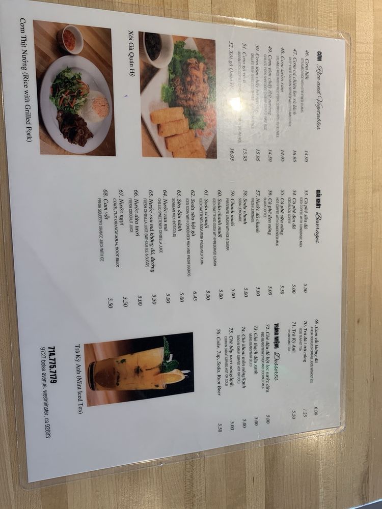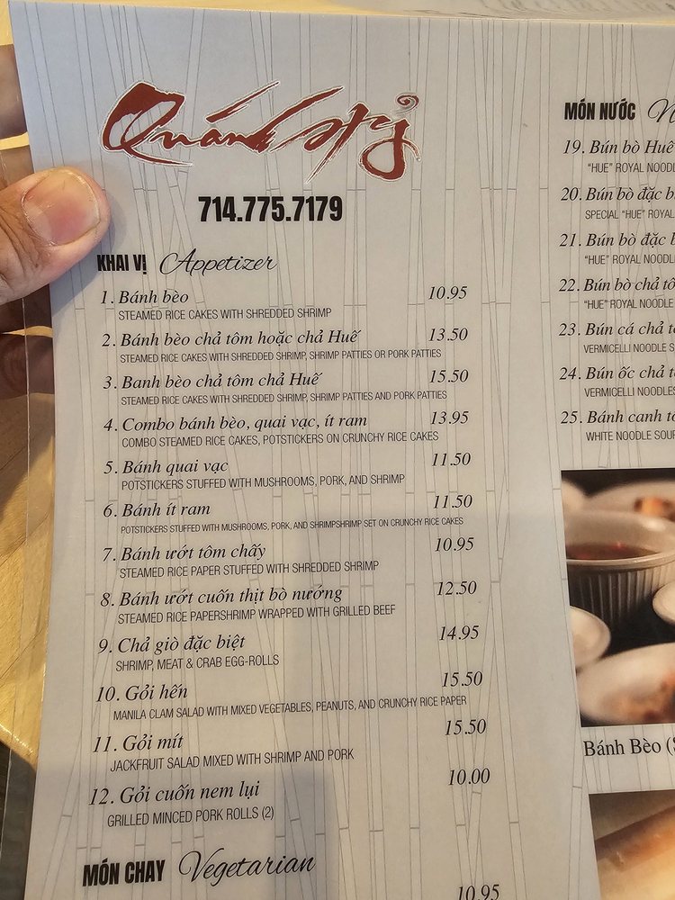Quan Hy Restaurant, located in Westminster, CA, offers a diverse menu featuring traditional Central Vietnamese cuisine with a modern twist. Known for their flavorful dishes and extensive vegetarian options, Quan Hy provides a welcoming atmosphere perfect for lunch or dinner. Customers praise the mi quang, banh beo, and bun bo hue for their authentic taste and quality ingredients. The restaurant also offers unique dishes like Com Ca Chien Bo Xa Lach, a crispy salmon dish served with a savory umami sauce. With efficient and friendly service, Quan Hy is a hidden gem worth revisiting. Prices are reasonable, averaging around $20 per person for an entree and a drink. If you're looking for something beyond the usual Vietnamese fare, Quan Hy Restaurant is a must-try destination.
