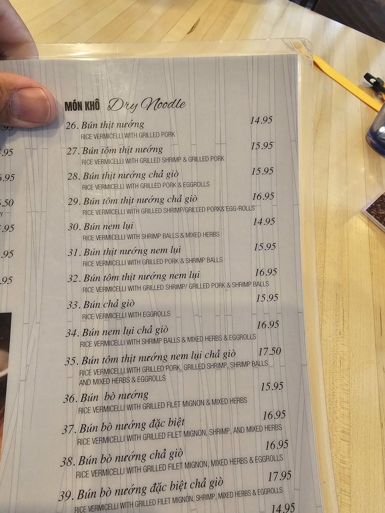 Rice vermicelli with grilled filet mignon, mixed herbs & eggrolls.